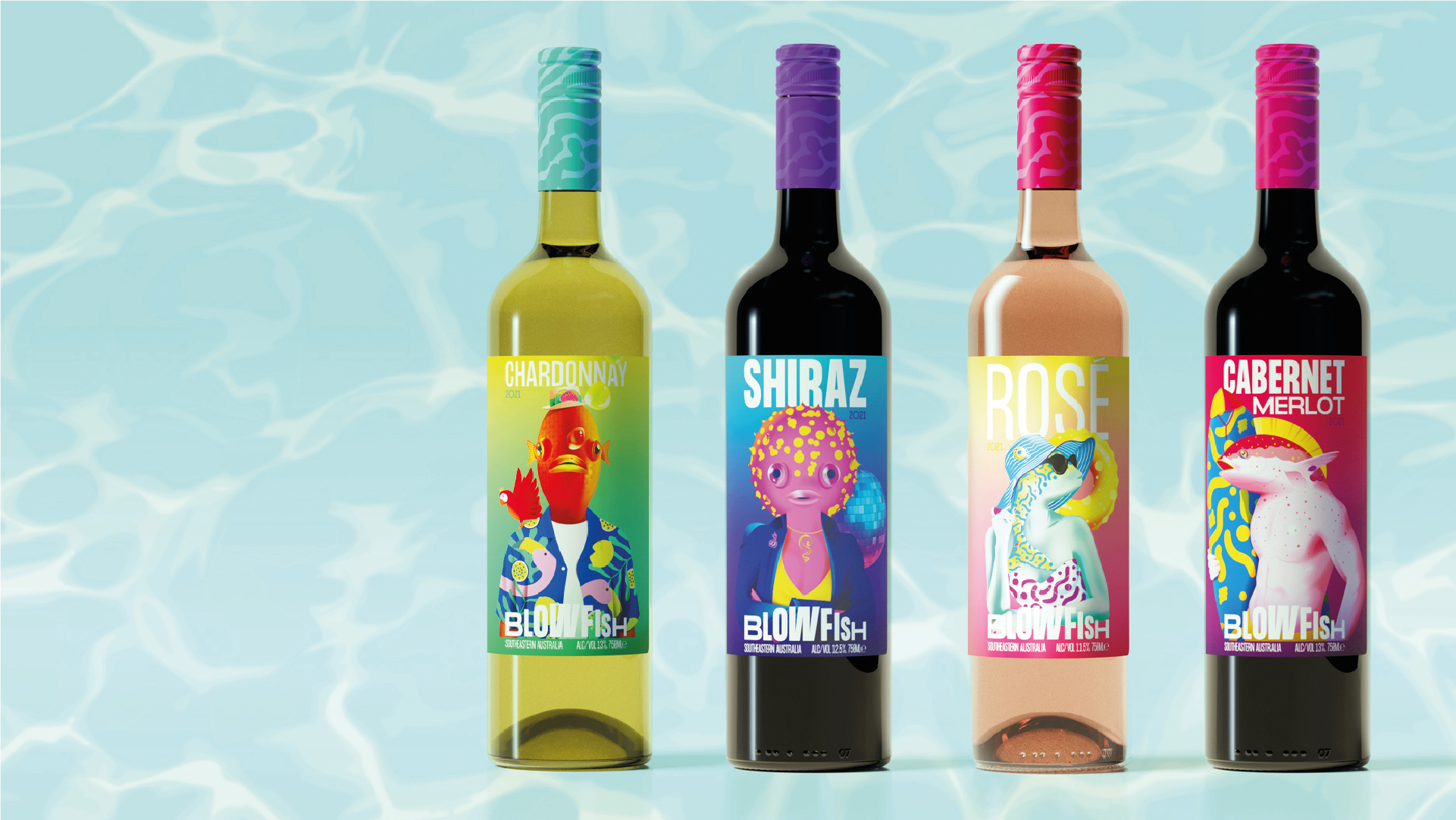 We recently created a new visual identity and redesigned packaging for Blowfish Australian Wines, from Hong Kong-based Milestone Beverages. Our brief was to help Milestone “Take the seriousness out of wine”. The redesigned range, available in Hong Kong, Taiwan, the Philippines, and Singapore, includes four wines: Shiraz, Cabernet Sauvignon, Chardonnay and Rosé, each featuring a bright and bold character inspired by Australia. The range is now bottled in lighter and smaller bottles to reduce its carbon footprint, aside from existing recycled components.